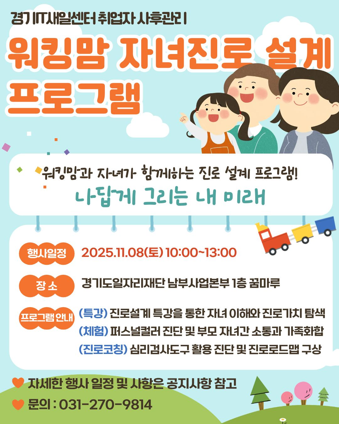 경기IT새일센터를 통해 취업하신 취업자 대상으로 워킹맘 자녀 진로설계 프로그램을 진행합니다.신청 사유를 고려하여 선착순 10가족을 모집하오니 빠른 신청 부탁드립니다.선정자에게는 개별연락 드립니다.